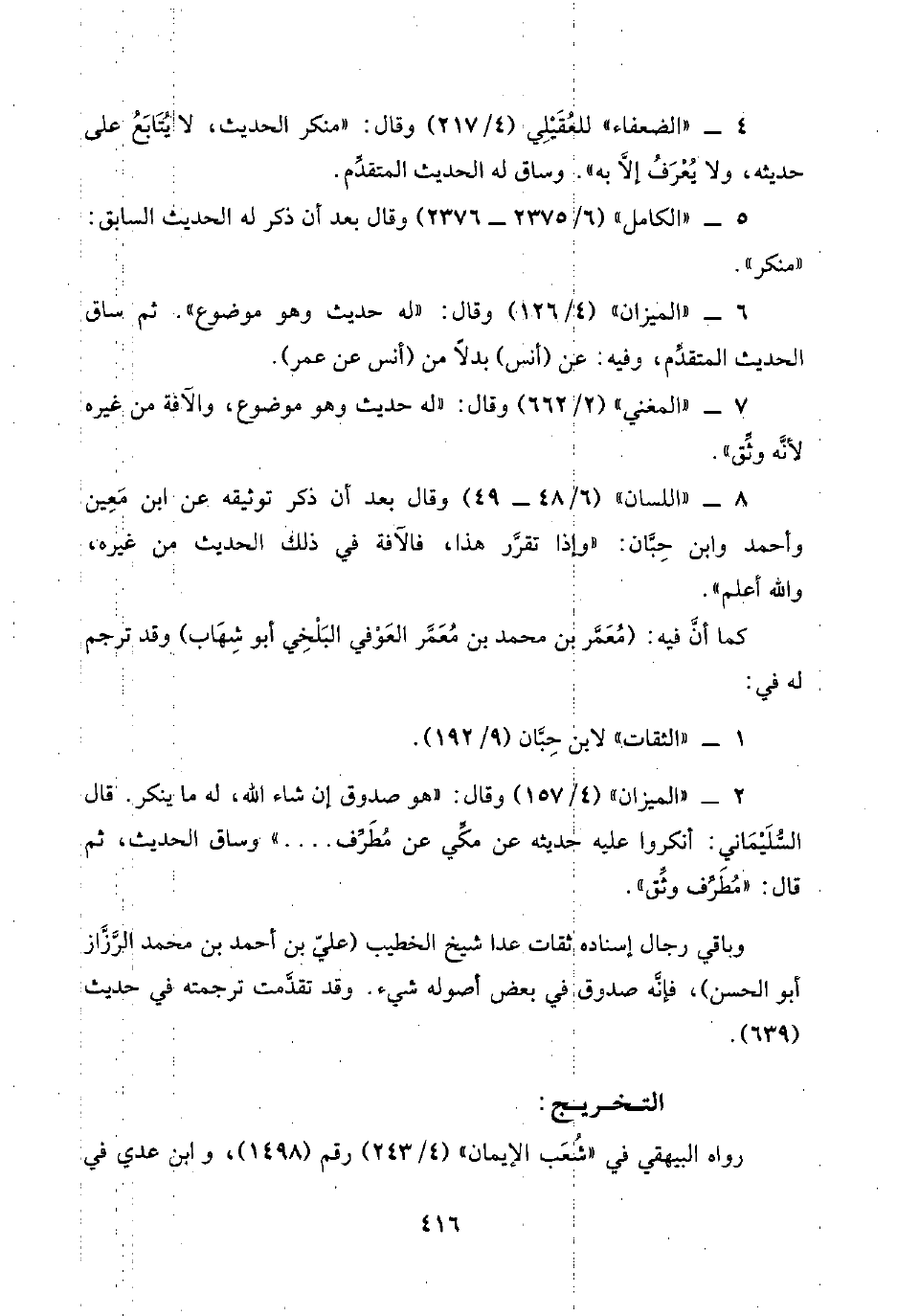 ٤ - "الضعفاء" للعُقَيْلِي (٤/ ٢١٧) وقال: "منكر الحديث، لا يُتَابَعُ على حديثه، ولا يُعْرَفُ إلَّا به". وساق له الحديث المتقدِّم.