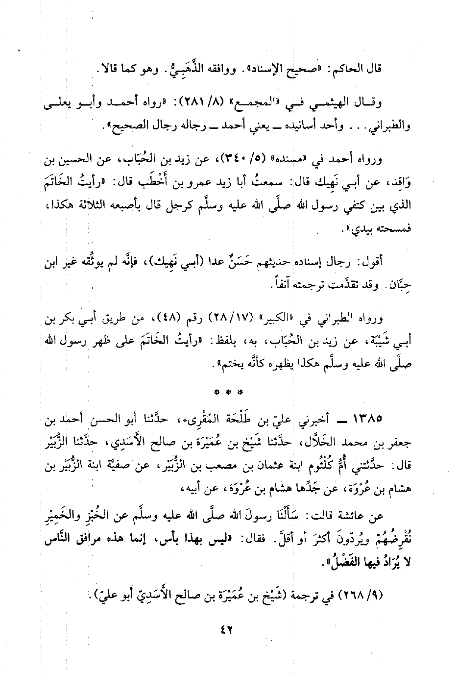 ورواه أحمد في "مسنده" (٥/ ٣٤٠)، عن زيد بن الحُبَاب، عن الحسين بن وَاقِد، عن أبي نَهِيك قال: سمعتُ أبا زيد عمرو بن أَخْطَب قال: "رأيتُ الخَاتَمَ الذي بين كتفي رسول اللَّه صلَّى اللَّه عليه وسلَّم كرجل قال بأصبعه الثلاثة هكذا، فمسحته بيدي".