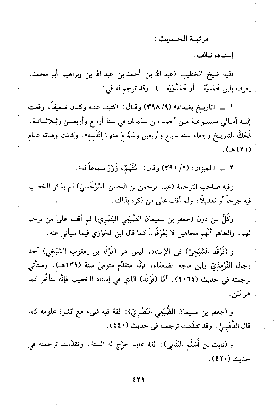وفيه صاحب الترجمة (عبد الرحمن بن الحسن السَّرْخَسِيّ) لم يذكر الخطيب فيه جرحًا أو تعديلًا، ولم أقف على من ذكره بذلك.