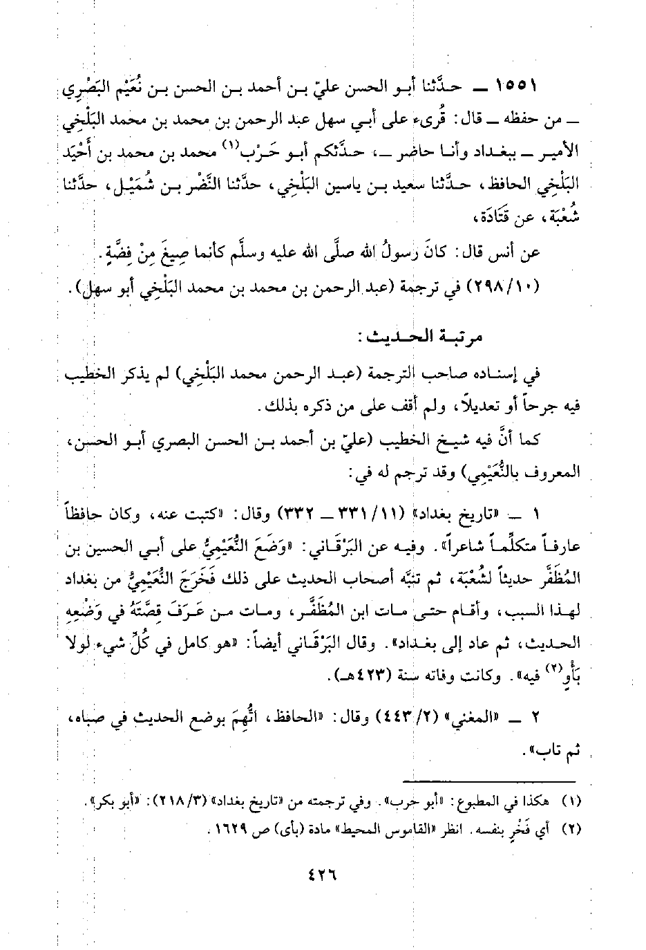 ١٥٥١ - حدَّثنا أبو الحسن عليّ بن أحمد بن الحسن بن نُعَيْم البَصْرِي -من حفظه- قال: قُرئ على أبي سهل عبد الرحمن بن محمد بن محمد البَلْخِي الأمير -ببغداد وأنا حاضر-، حدَّثكم أبو حَرْب (¬١) محمد بن محمد بن أَحْيَد البَلْخِي الحافظ، حدَّثنا سعيد بن ياسين البَلْخِي، حدَّثنا النَّضْر بن شُمَيْل، حدَّثنا شُعْبَة، عن قَتَادَة،