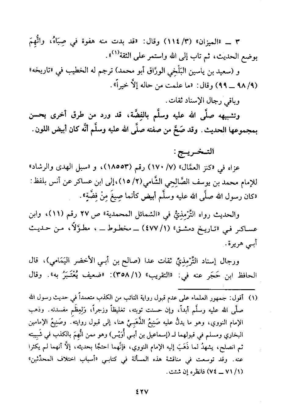 وتشبيهه صلَّى اللَّه عليه وسلَّم بالفِضَّة، قد ورد من طرق أخرى بحسن بمجموعها الحديث. وقد صَحَّ من صفته صلَّى اللَّه عليه وسلَّم أنَّه كان أبيض اللون.