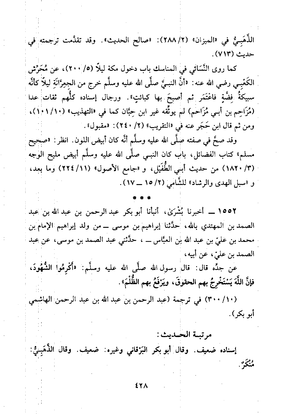 ١٥٥٢ - أخبرنا بُشْرَى، أنبأنا أبو بكر عبد الرحمن بن عبد اللَّه بن عبد الصمد بن المهتدي باللَّه، حدَّثنا إبراهيم بن موسى -من ولد إبراهيم الإمام بن محمد بن عليّ بن عبد اللَّه بن العبَّاس-، حدَّثني عبد الصمد بن موسى، عن عبد الصمد بن عليّ، عن أبيه،
