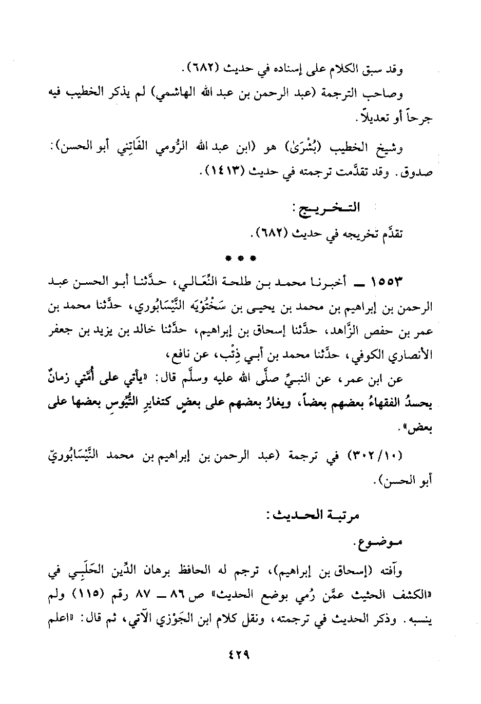 ١٥٥٣ - أخبرنا محمد بن طلحة النِّعَالي، حدَّثنا أبو الحسن عبد الرحمن بن إبراهيم بن محمد بن يحيى بن سَخْتُويَه النَّيْسَابُوري، حدَّثنا محمد بن عمر بن حفص الزَّاهد، حدَّثنا إسحاق بن إبراهيم، حدَّثنا خالد بن يزيد بن جعفر الأنصاري الكوفي، حدَّثنا محمد بن أبي ذِئْب، عن نافع،