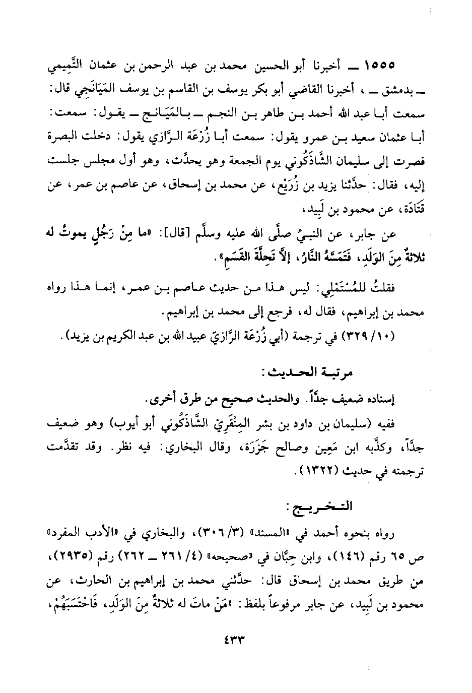 عن جابر، عن النبيِّ صلَّى اللَّه عليه وسلَّم [قال]: "ما مِنْ رَجُلٍ بموتُ له ثلاثةٌ مِنَ الوَلَدِ، فَتَمَسَّهُ النَّارُ، إلَّا تَحِلَّةَ القَسَمِ".