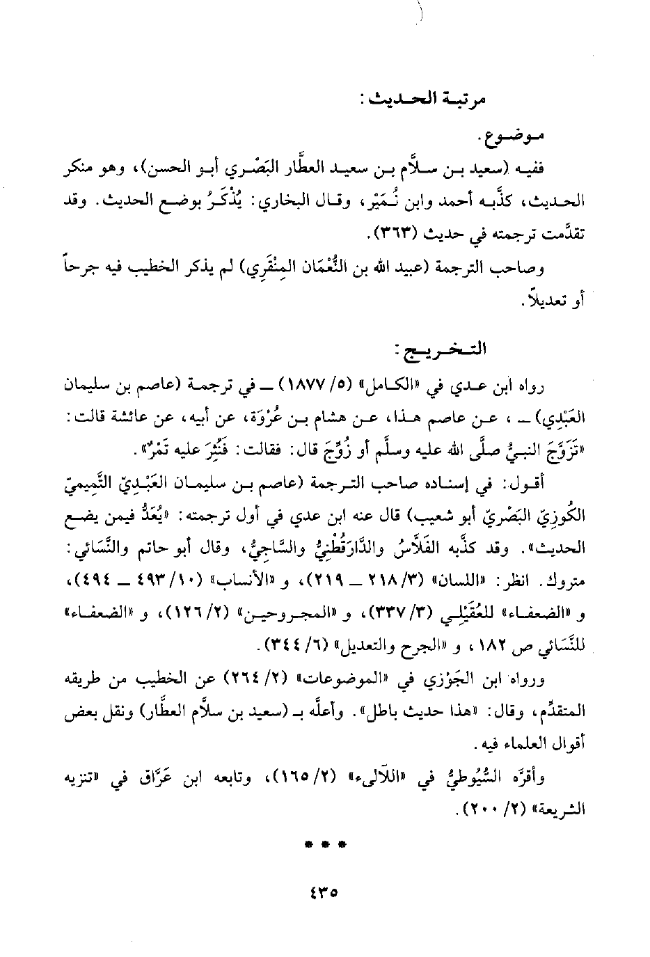 ورواه ابن الجَوْزي في "الموضوعات" (٢/ ٢٦٤) عن الخطيب من طريقه المتقدِّم، وقال: "هذا حديث باطل". وأعلَّه بـ (سعيد بن سلَّام العَطَّار) ونقل بعض أقوال العلماء فيه.