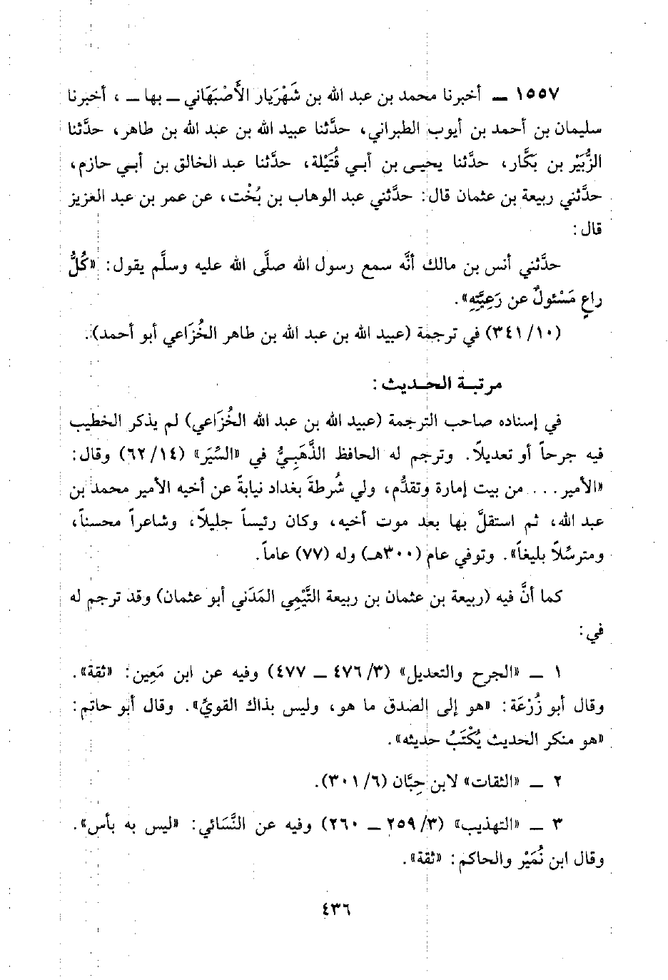 ١٥٥٧ - أخبرنا محمد بن عبد اللَّه بن شَهْرَيَار الأَصْبَهَاني -بها-، أخبرنا سليمان بن أحمد بن أيوب الطبراني، حدَّثنا عبيد اللَّه بن عبد اللَّه بن طاهر، حدَّثنا الزُّبَيْر بن بكَّار، حدَّثنا يحيى بن أبي قُتَيْلة، حدَّثنا عبد الخالق بن أبي حازم، حدَّثني ربيعة بن عثمان قال: حدَّثني عبد الوهاب بن بُخْت، عن عمر بن عبد العزيز قال: