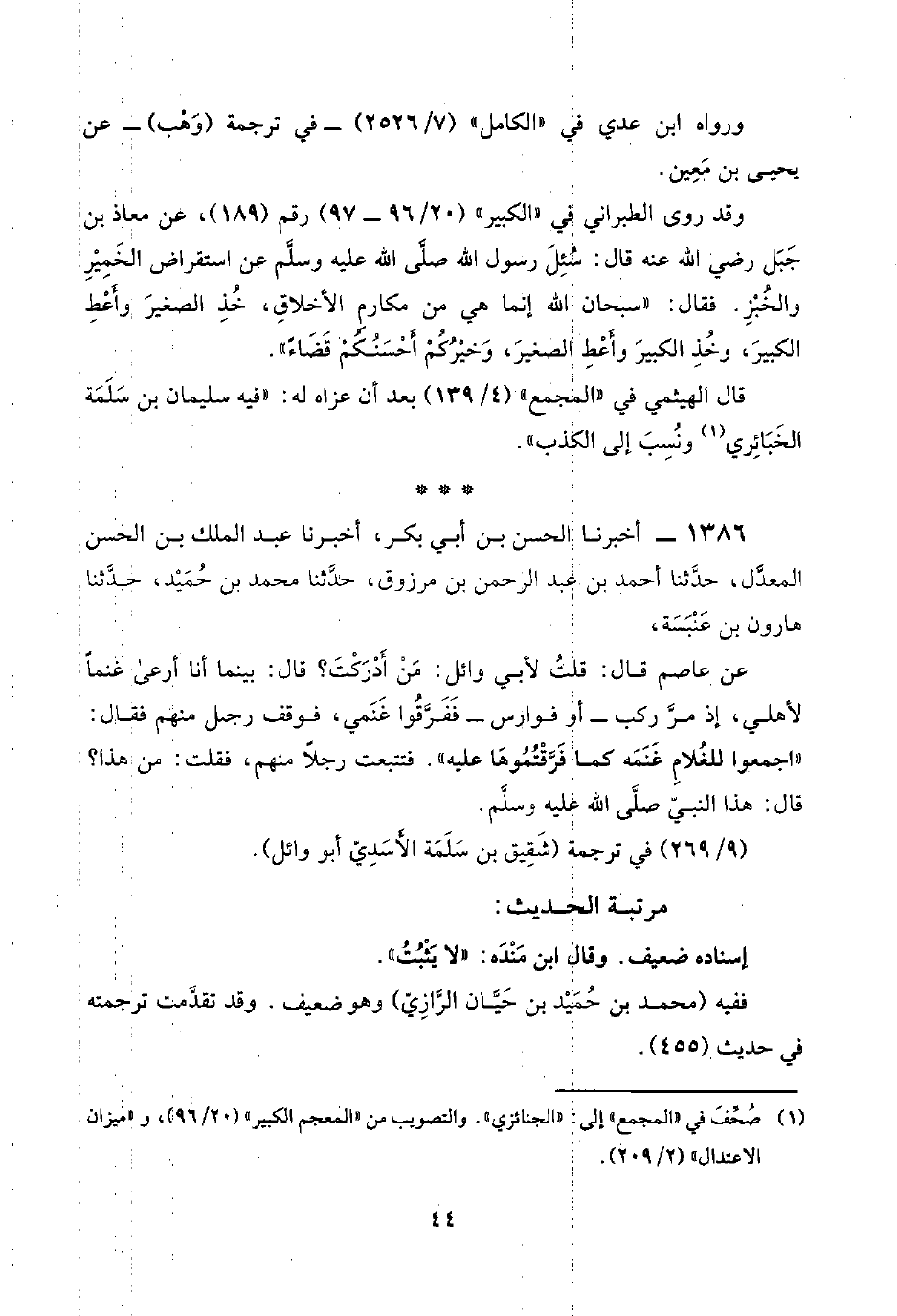١٣٨٦ - أخبرنا الحسن بن أبي بكر، أخبرنا عبد الملك بن الحسن المعدَّل، حدَّثنا أحمد بن عبد الرحمن بن مرزوق، حدَّثنا محمد بن حُمَيْد، حدَّثنا هارون بن عَنْبَسَة،