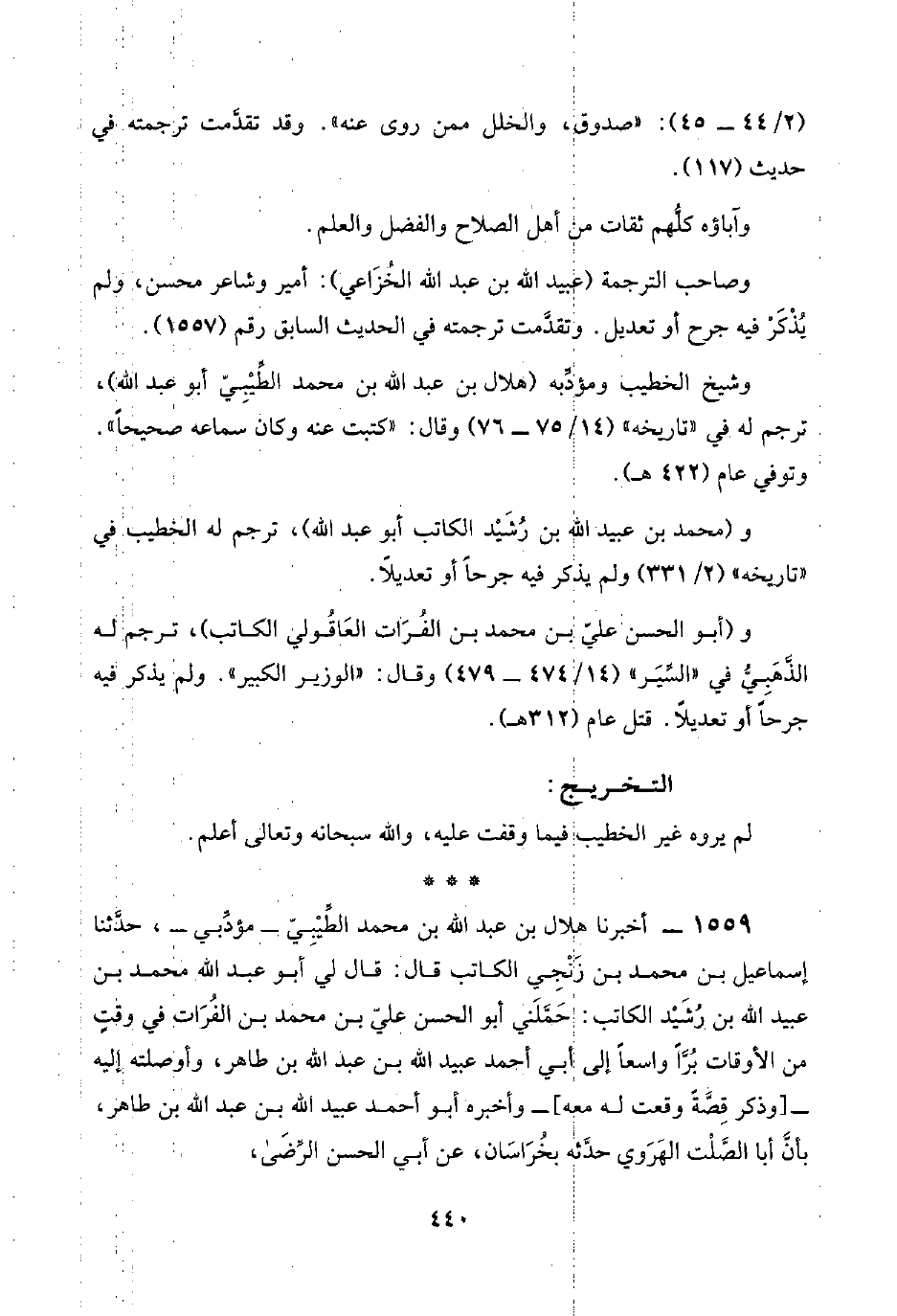 ١٥٥٩ - أخبرنا هلال بن عبد اللَّه بن محمد الطِّيْبِيّ -مؤدِّبي-، حدَّثنا إسماعيل بن محمد بن زَنْجِي الكاتب قال: قال لي أبو عبد اللَّه محمد بن عبيد اللَّه بن رُشَيْد الكاتب: حَمَّلَني أبو الحسن عليّ بن محمد بن الفُرَات في وقتٍ من الأوقات بُرًّا واسعًا إلى أبي أحمد عبيد اللَّه بن عبد اللَّه بن طاهر، وأوصلته إليه -[وذكر قِصَّةً وقعت له معه]- وأخبره أبو أحمد عبيد اللَّه بن عبد اللَّه بن طاهر، بأنَّ أبا الصَّلْت الهَرَوي حدَّثه بخُرَاسَان، عن أبي الحسن الرِّضَى،