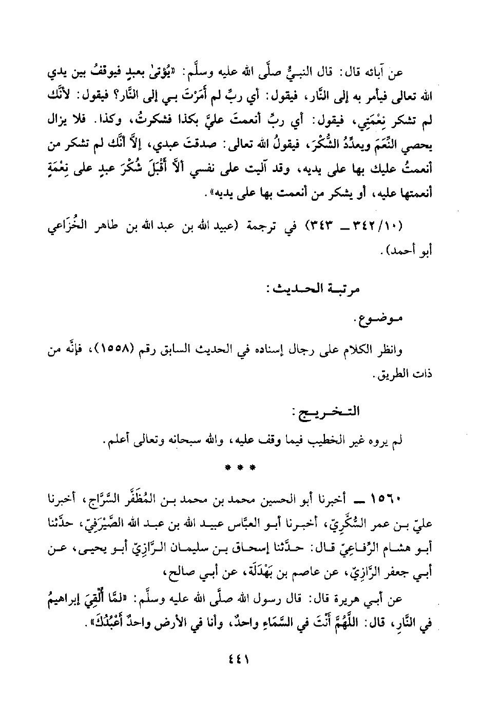 ١٥٦٠ - أخبرنا أبو الحسين محمد بن محمد بن المُظَفَّر السَّرَّاج، أخبرنا عليّ بن عمر السُّكَّرِيّ، أخبرنا أبو العبَّاس عبيد اللَّه بن عبد اللَّه الصَّيْرَفِيّ، حدَّثنا أبو هشام الرِّفاعِيّ قال: حدَّثنا إسحاق بن سليمان الرَّازِيّ أبو يحيى، عن أبي جعفر الرَّازِيّ، عن عاصم بن بَهْدَلَة، عن أبي صالح،