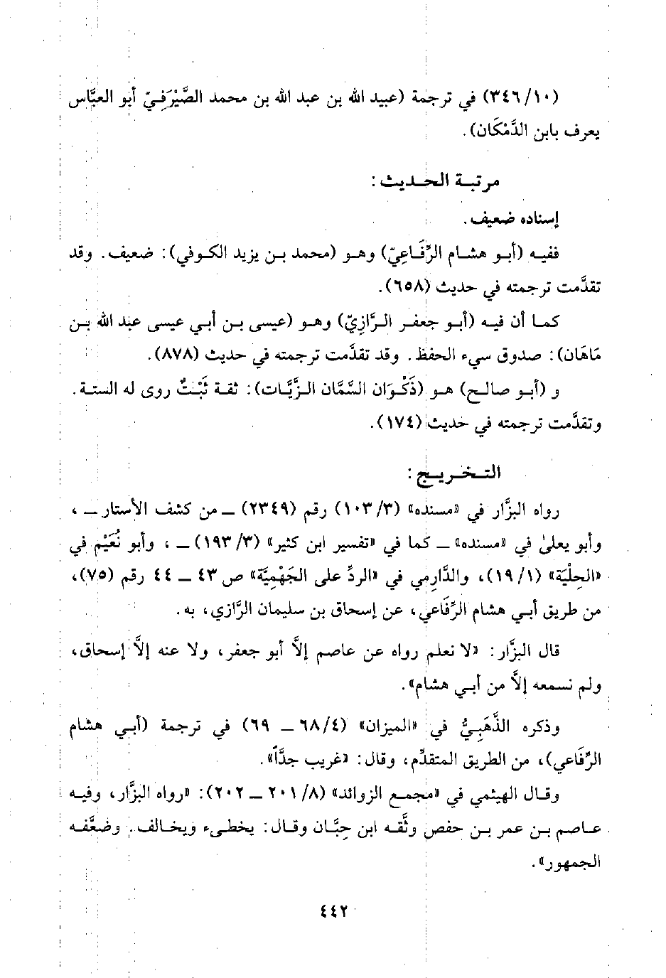 رواه البَزَّار في "مسنده" (٣/ ١٠٣) رقم (٢٣٤٩) -من كشف الأستار-، وأبو يعلى في "مسنده" -كما في "تفسير ابن كثير" (٣/ ١٩٣) -، وأبو نُعَيْم في "الحِلْيَة" (١/ ١٩)، والدَّارِمي في "الردِّ على الجَهْمِيَّة" ص ٤٣ - ٤٤ رقم (٧٥)، من طريق أبي هشام الرِّفَاعي، عن إسحاق بن سليمان الرَّازي، به.