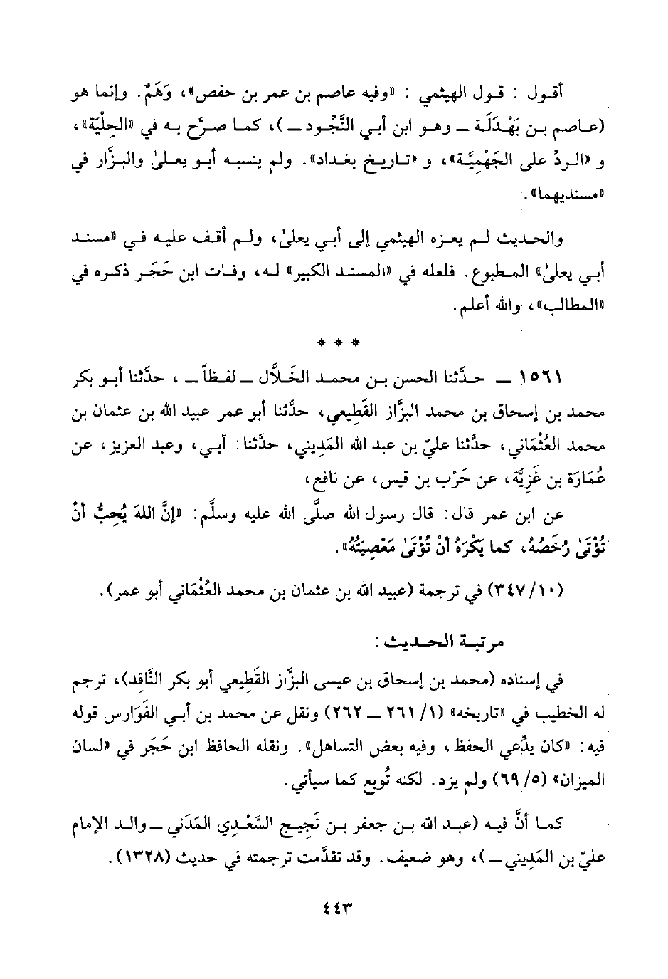 ١٥٦١ - حدَّثنا الحسن بن محمد الخَلَّال -لفظًا-، حدَّثنا أبو بكر محمد بن إسحاق بن محمد البزَّاز القَطِيْعِي، حدَّثنا أبو عمر عبيد اللَّه بن عثمان بن محمد العُثْمَاني، حدَّثنا عليّ بن عبد اللَّه المَدِيني، حدَّثنا: أبي، وعبد العزيز، عن عُمَارة بن غَزِيَّة، عن حَرْب بن قيس، عن نافع،