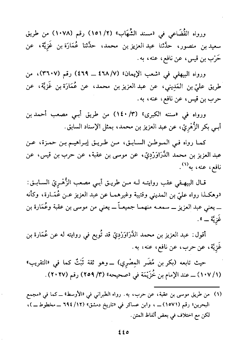ورواه القُضَاعِي في "مسند الشِّهَاب" (٢/ ١٥١) رقم (١٠٧٨) من طريق سعيد بن منصور، حدَّثنا عبد العزيز بن محمد، حدَّثنا عُمَارَة بن غَزِيَّة، عن حَرْب بن قيس، عن نافع، عنه، به.