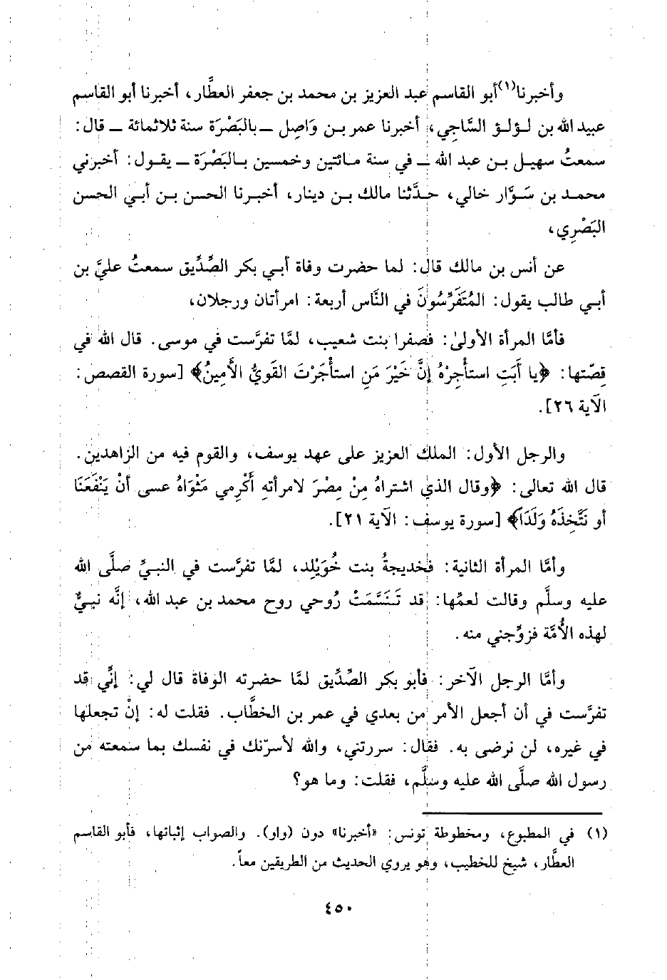 عن أنس بن مالك قال: لما حضرت وفاة أبي بكر الصِّدِّيق سمعتُ عليَّ بن أبي طالب يقول: المُتَفَرِّسُون في النَّاس أربعة: امرأتان ورجلان،