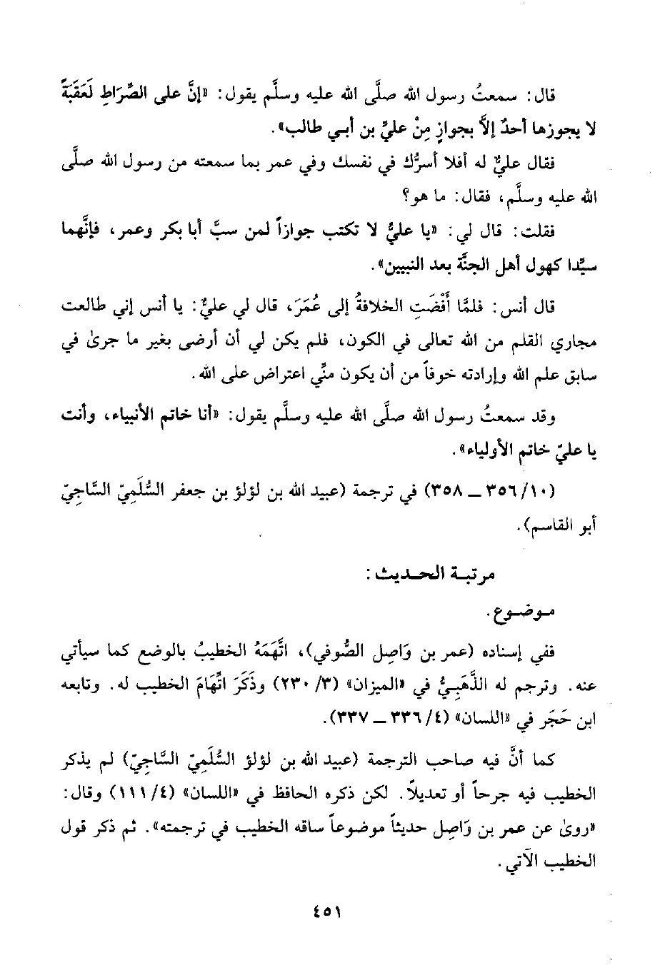 كما أنَّ فيه صاحب الترجمة (عبيد اللَّه بن لؤلؤ السُّلَمِيّ السَّاجِيّ) لم يذكر الخطيب فيه جرحًا أو تعديلًا. لكن ذكره الحافظ في "اللسان" (٤/ ١١١) وقال: "روى عن عمر بن وَاصِل حديثًا موضوعًا ساقه الخطيب في ترجمته". ثم ذكر قول الخطيب الآتي.