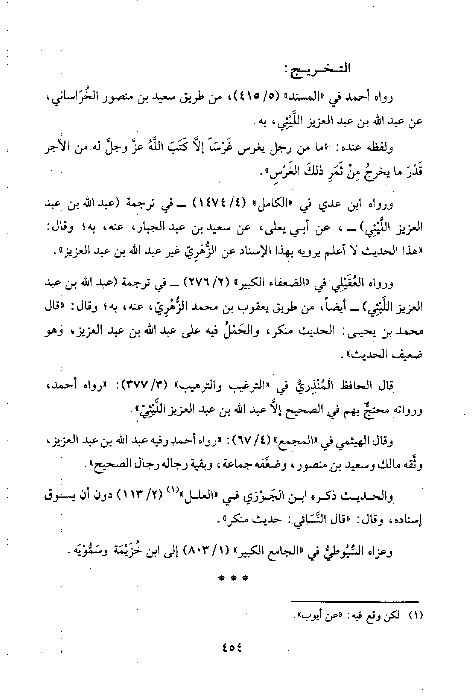 قال الحافظ المُنْذِريُّ في "الترغيب والترهيب" (٣/ ٣٧٧): "رواه أحمد، ورواته محتجٌّ بهم في الصحيح إلَّا عبد اللَّه بن عبد العزيز اللَّيْثِيّ".