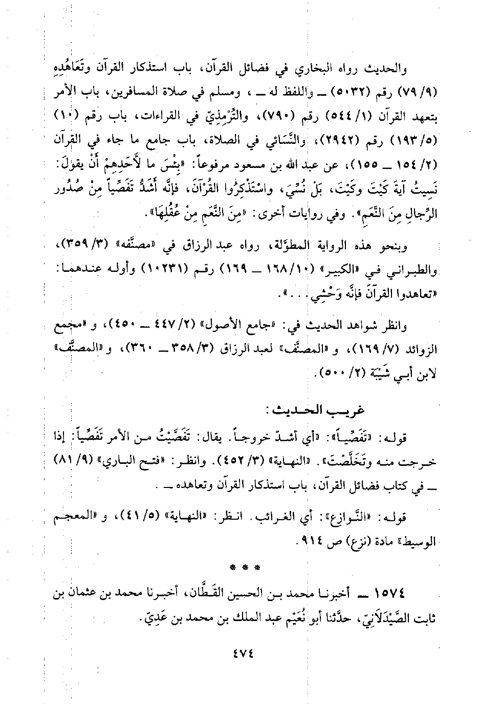 والحديث رواه البخاري في فضائل القرآن، باب استذكار القرآن وتَعَاهُدِهِ (٩/ ٧٩) رقم (٥٠٣٢) -واللفظ له-، ومسلم في صلاة المسافرين، باب الأمر بتعهد القرآن (١/ ٥٤٤) رقم (٧٩٠)، والتِّرْمِذِيّ في القراءات، باب رقم (١٠) (٥/ ١٩٣) رقم (٢٩٤٢)، والنَّسَائي في الصلاة، باب جامع ما جاء في القرآن (٢/ ١٥٤ - ١٥٥)، عن عبد اللَّه بن مسعود مرفوعًا: "بِئْسَ ما لأَحَدِهِمْ أَنْ يقولَ: نَسِيتُ آيةَ كَيْتَ وكَيْتَ، بَلْ نُسِّيَ، واسْتَذْكِرُوا القُرْآنَ، فإنَّه أَشَدُّ تَفَصِّيًا مِنْ صُدُور الرِّجالِ مِنَ النَّعَمِ". وفي روايات أخرى: "مِنَ النَّعَمِ مِنْ عُقُلِهَا".