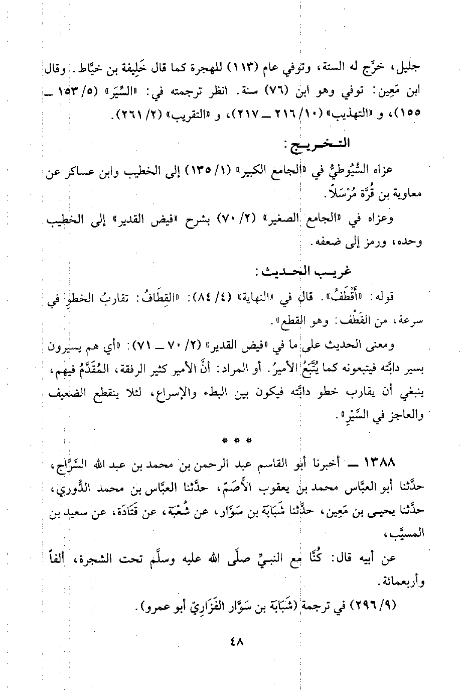 ١٣٨٨ - أخبرنا أبو القاسم عبد الرحمن بن محمد بن عبد اللَّه السَّرَّاج، حدَّثنا أبو العبَّاس محمد بن يعقوب الأَصَمّ، حدَّثنا العبَّاس بن محمد الدُّوري، حدَّثنا يحيى بن مَعِين، حدَّثنا شَبَابَة بن سَوَّار، عن شُعْبَة، عن قَتَادَة، عن سعيد بن المسيَّب،