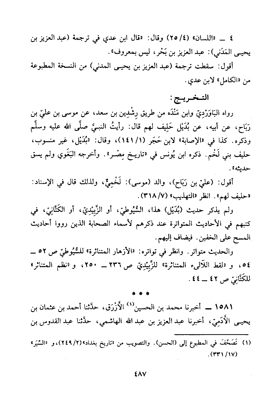ولم يذكر حديث (بُدَيْل) هذا، السُّيُوطيّ، أو الزَّبِيْدِيّ، أو الكَتَّانِيّ، في كتبهم في الأحاديث المتواترة عند ذكرهم لأسماء الصحابة الذين رووا أحاديث المسح على الخفين. فيضاف إليهم.