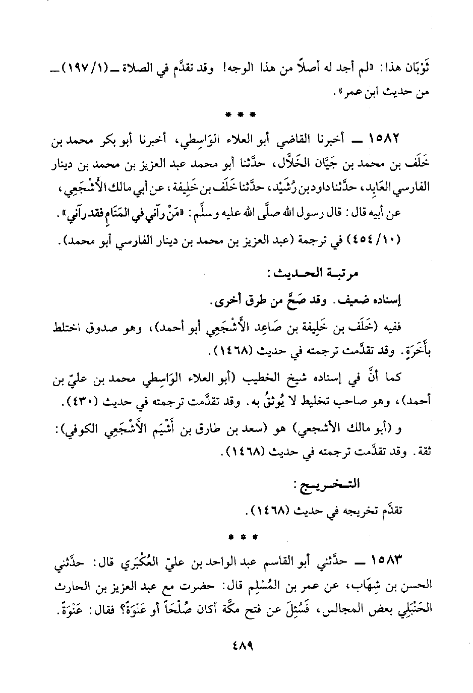 ١٥٨٢ - أخبرنا القاضي أبو العلاء الوَاسِطي، أخبرنا أبو بكر محمد بن خَلَف بن محمد بن جَيَّان الخَلَّال، حدَّثنا أبو محمد عبد العزيز بن محمد بن دينار الفارسي العَابِد، حدَّثنا داود بن رُشَيْد، حدَّثنا خَلَف بن خَلِيفة، عن أبي مالك الأَشْجَعِي،