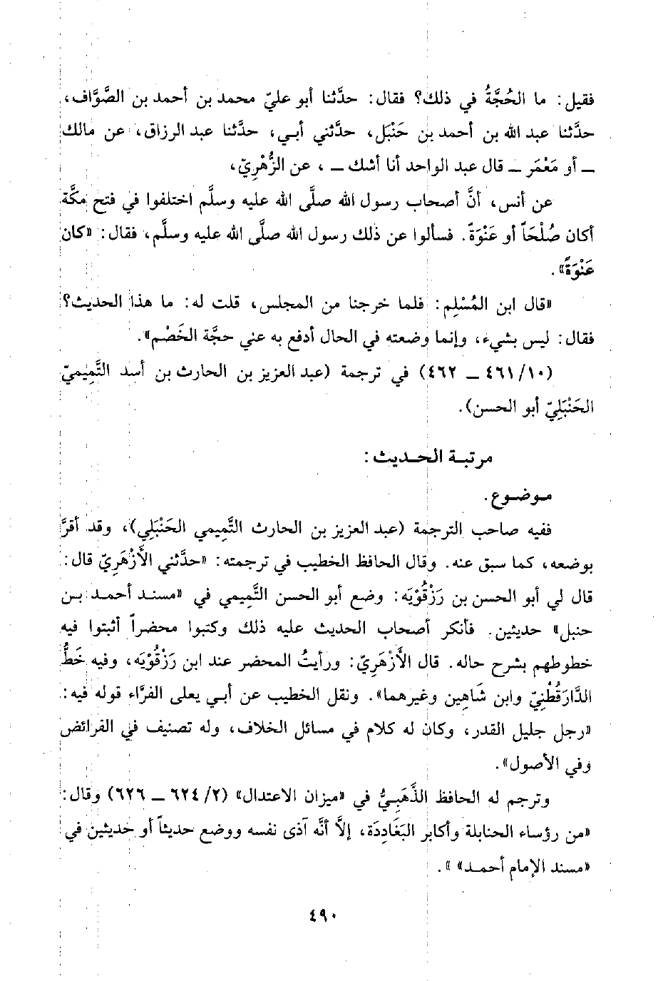 فقيل: ما الحُجَّةُ في ذلك؟ فقال: حدَّثنا أبو عليّ محمد بن أحمد بن الصَّوَّاف، حدَّثنا عبد اللَّه بن أحمد بن حَنْبَل، حدَّثني أبي، حدَّثنا عبد الرزاق، عن مالك -أو مَعْمَر- قال عبد الواحد أنا أشك-، عن الزُّهْرِيّ،