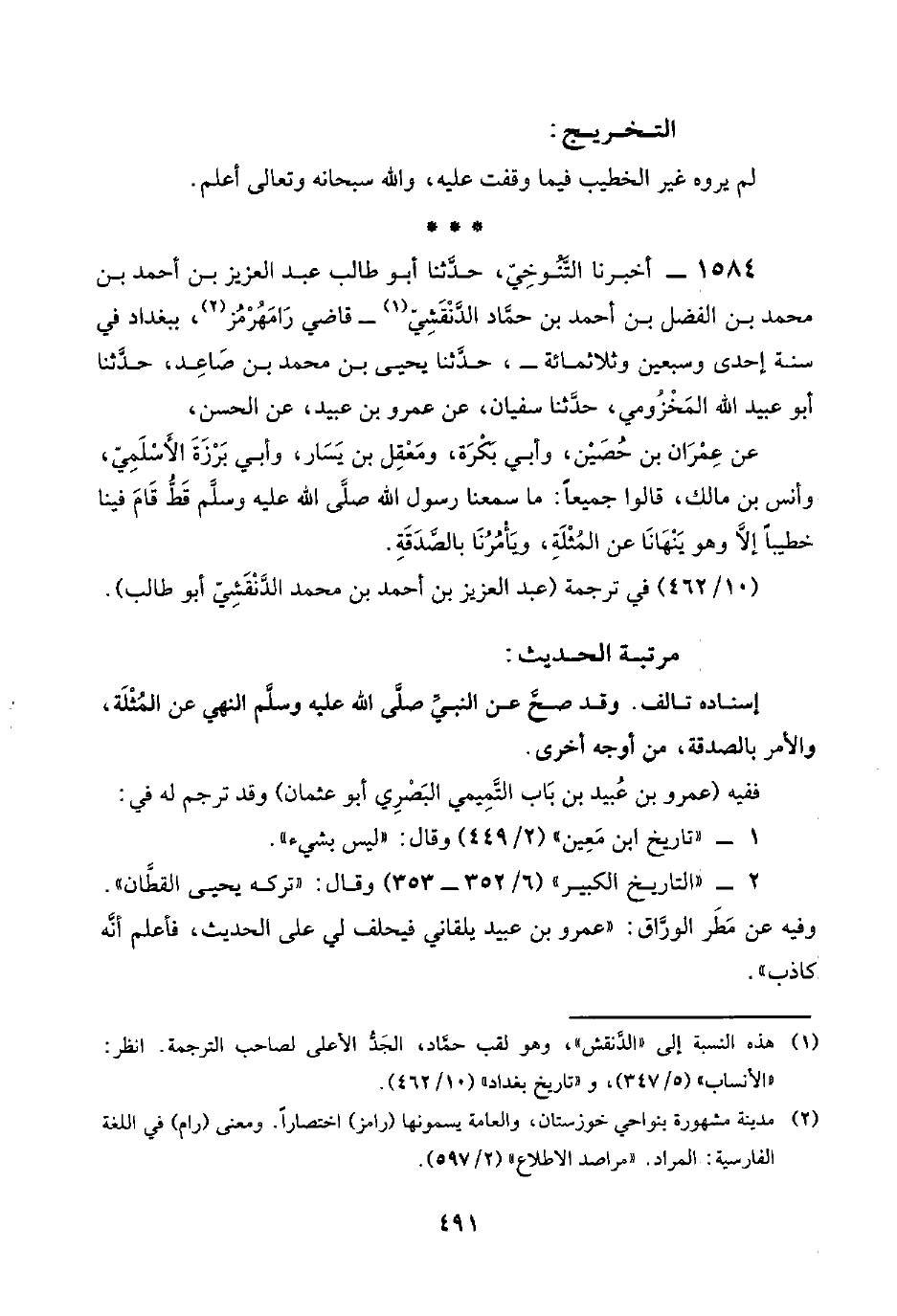 ١٥٨٤ - أخبرنا التَّنُوخِيّ، حدَّثنا أبو طالب عبد العزيز بن أحمد بن محمد بن الفضل بن أحمد بن حمَّاد الدَّنْقَشِيّ (¬١) -قاضي رَامَهُرْمُز (¬٢)، ببغداد في سنة إحدى وسبعين وثلاثمائة-، حدَّثنا يحيى بن محمد بن صَاعِد، حدَّثنا أبو عبيد اللَّه المَخْزُومي، حدَّثنا سفيان، عن عمرو بن عبيد، عن الحسن،