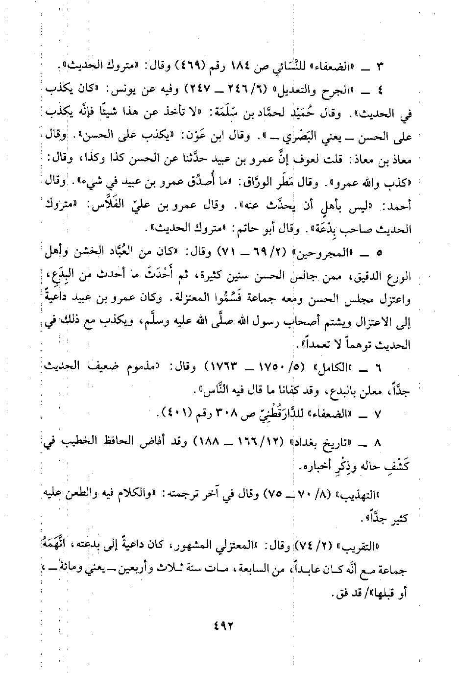 ٥ - "المجروحين" (٢/ ٦٩ - ٧١) وقال: "كان من العُبَّاد الخشن وأهل الورع الدقيق، ممن جالس الحسن سنين كثيرة، ثم أَحْدَثَ ما أحدث من البِدَعِ، واعتزل مجلس الحسن ومعه جماعة فَسُمُّوا المعتزلة. وكان عمرو بن عبيد داعيةً إلى الاعتزال ويشتم أصحاب رسول اللَّه صلَّى اللَّه عليه وسلَّم، ويكذب مع ذلك في الحديث توهمًا لا تعمدًا".