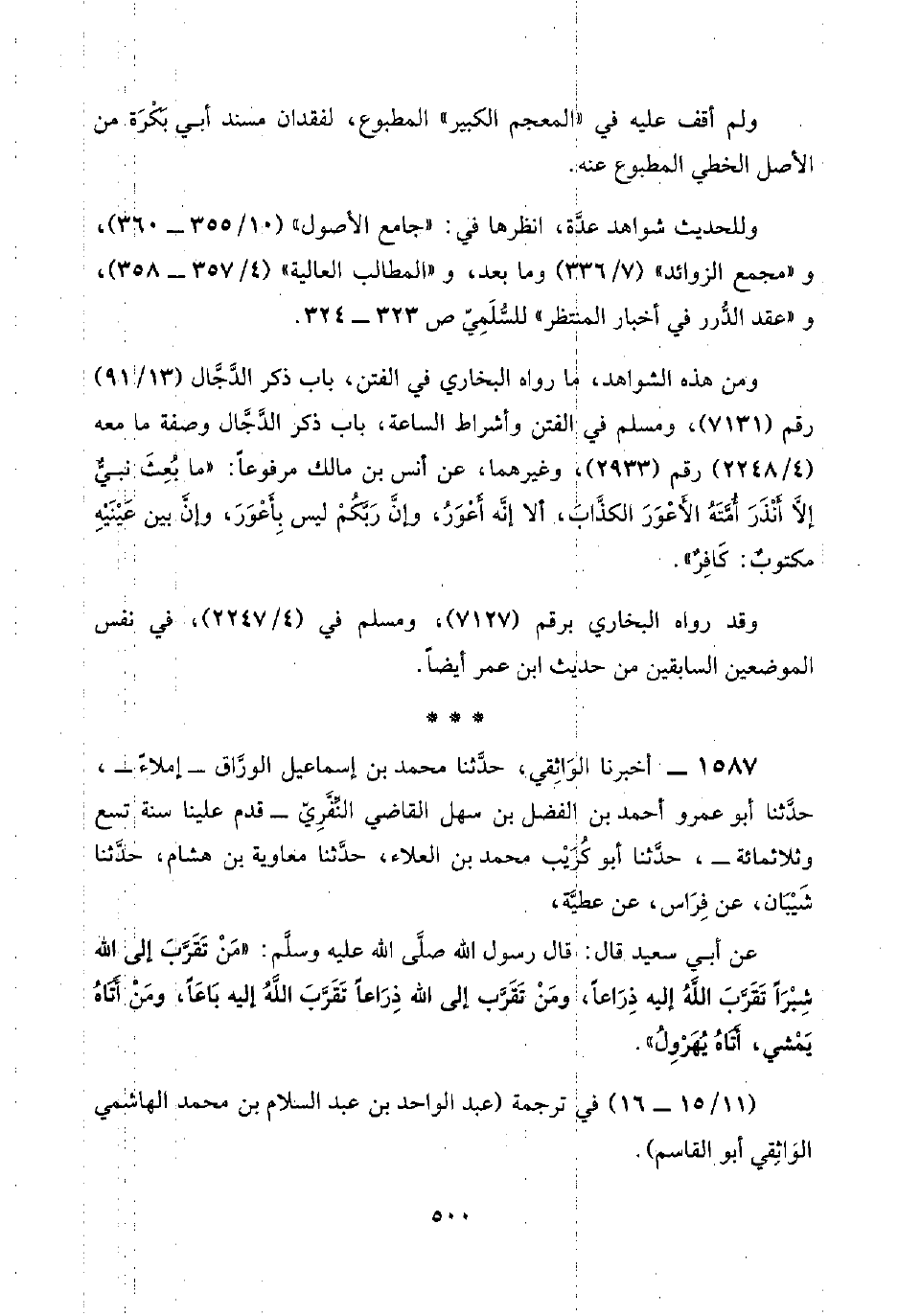 ١٥٨٧ - أخبرنا الوَاثِقي، حدَّثنا محمد بن إسماعيل الورَّاق -إملاءً-، حدَّثنا أبو عمرو أحمد بن الفضل بن سهل القاضي النِّفَّرِيّ -قدم علينا سنة تسع وثلاثمائة-، حدَّثنا أبو كُرَيْب محمد بن العلاء، حدَّثنا معاوية بن هشام، حدَّثنا شَيْبَان، عن فِرَاس، عن عطيَّة،