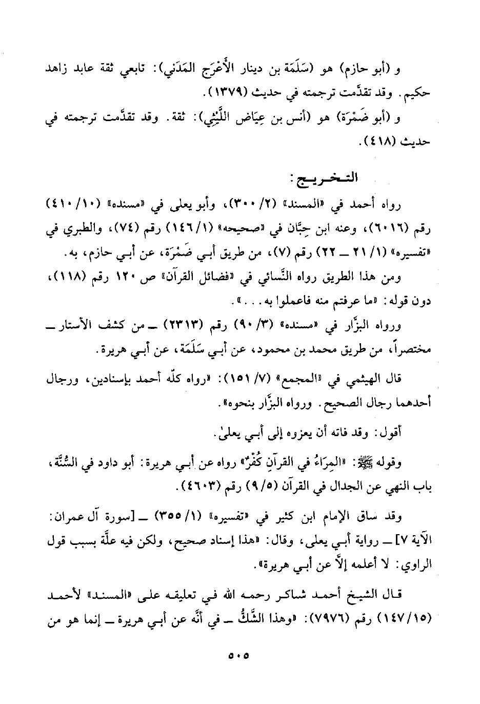 قال الشيخ أحمد شاكر رحمه اللَّه في تعليقه على "المسند" لأحمد (١٥/ ١٤٧) رقم (٧٩٧٦): وهذا الشَّكُّ -في أنَّه عن أبي هريرة- إنما هو من
