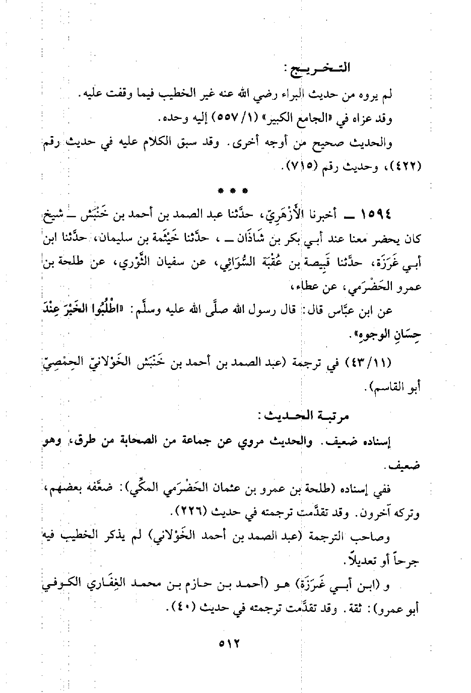 ١٥٩٤ - أخبرنا الأَزْهَرِيّ، حدَّثنا عبد الصمد بن أحمد بن خَنْبَش -شيخ كان يحضر معنا عند أبي بكر بن شَاذَان-، حدَّثنا خَيْثَمة بن سليمان، حدَّثنا ابن أبي غَرَزَة، حدَّثنا قَبِيصة بن عُقْبَة السُّوَائِي، عن سفيان الثَّوْري، عن طلحة بن عمرو الحَضْرَمي، عن عطاء،