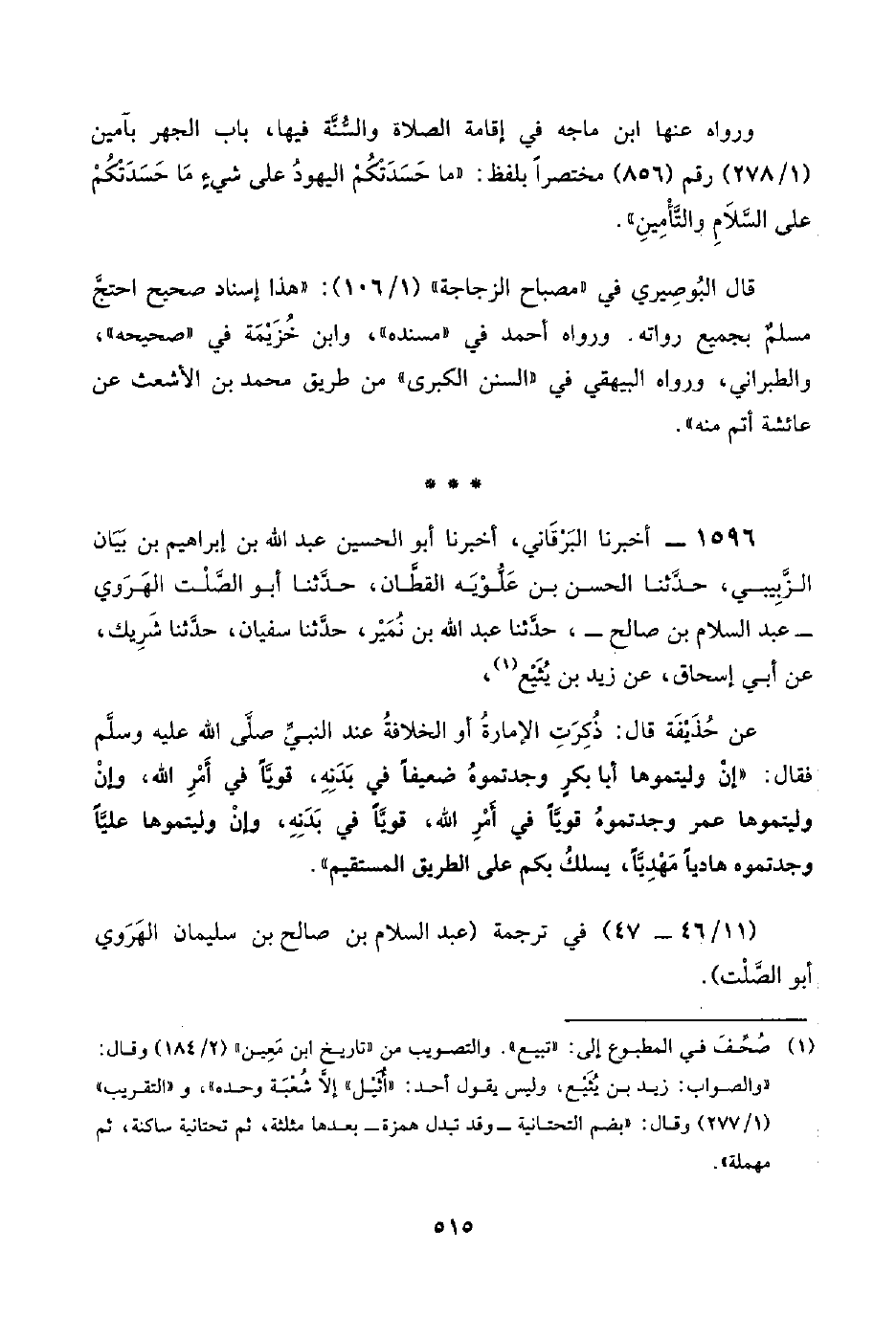 ١٥٩٦ - أخبرنا البَرْقَاني، أخبرنا أبو الحسين عبد اللَّه بن إبراهيم بن بَيَان الزَّبِيبي، حدَّثنا الحسن بن عَلُّوْيَه القطَّان، حدَّثنا أبو الصَّلْت الهَرَوي -عبد السلام بن صالح-، حدَّثنا عبد اللَّه بن نُمَيْر، حدَّثنا سفيان، حدَّثنا شَرِيك، عن أبي إسحاق، عن زيد بن يُثَيْع (¬١)،