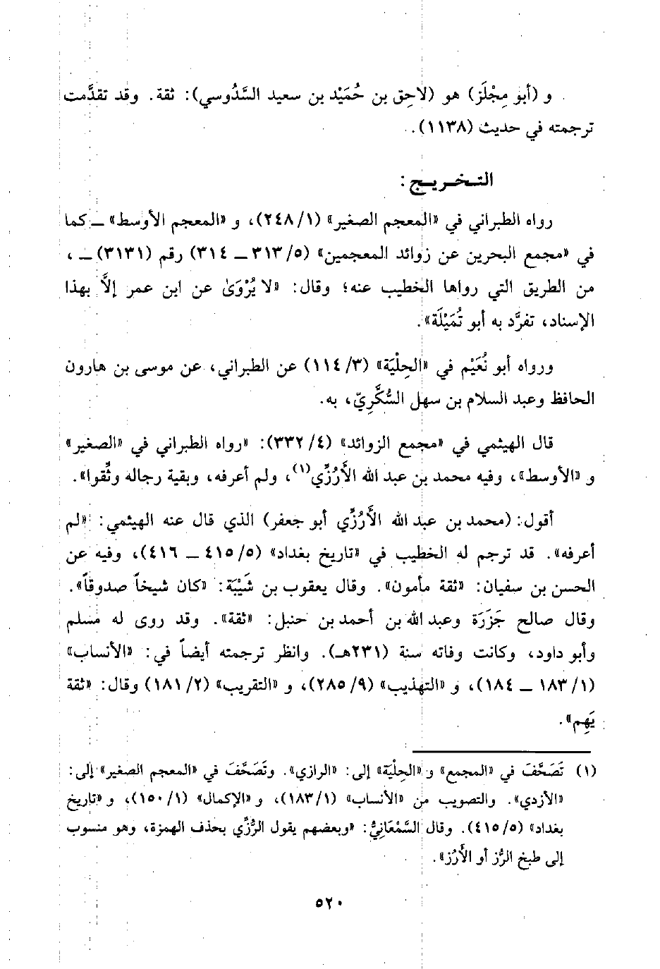 (¬١) تَصَحَّفَ في "المجمع" و"الحِلْيَة" إلى: "الرازي". وتَصَحَّفَ في "المعجم الصغير" إلى: "الأزدي". والتصويب من "الأنساب" (١/ ١٨٣)، و"الإكمال" (١/ ١٥٠)، و"تاريخ بغداد" (٥/ ٤١٥). وقال السَّمْعَانِيُّ: "وبعضهم يقول الرُّزِّي بحذف الهمزة، وهو منسوب إلى طبخ الرُّز أو الأَرُز".