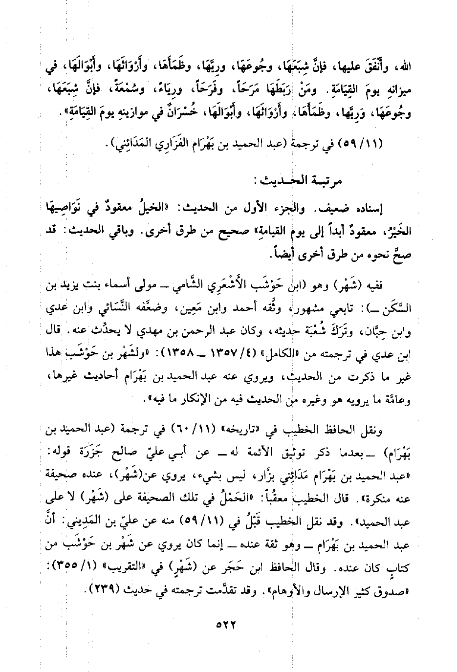 ونقل الحافظ الخطيب في "تاريخه" (١١/ ٦٠) في ترجمة (عبد الحميد بن بَهْرَام) -بعدما ذكر توثيق الأئمة له- عن أبي عليّ صالح جَزَرَة قوله: "عبد الحميد بن بَهْرَام مَدَائِني بزَّار، ليس بشيء، يروي عن (شَهْر)، عنده صحيفة عنه منكرة". قال الخطيب معقِّبًا: "الحَمْلُ في تلك الصحيفة على (شَهْر) لا على عبد الحميد". وقد نقل الخطيب قَبْلُ في (١١/ ٥٩) منه عن عليّ بن المَدِيني: أنَّ عبد الحميد بن بَهْرَام -وهو ثقة عنده- إنما كان يروي عن شَهْر بن حَوْشَب من كتابٍ كان عنده. وقال الحافظ ابن حَجَر عن (شَهْرٍ) في "التقريب" (١/ ٣٥٥): "صدوق كثير الإرسال والأوهام". وقد تقدَّمت ترجمته في حديث (٢٣٩).