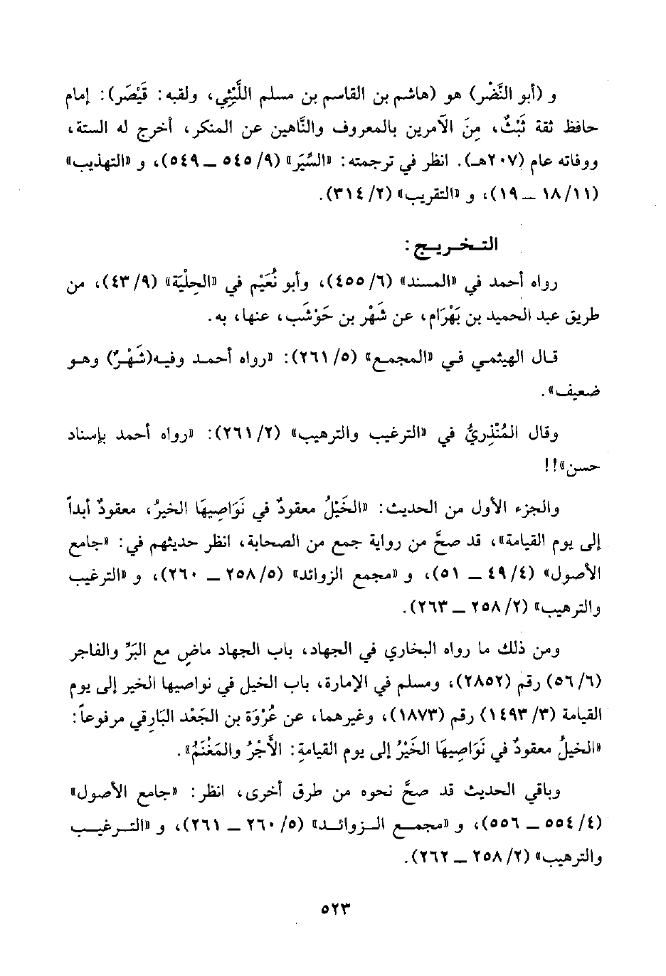 ومن ذلك ما رواه البخاري في الجهاد، باب الجهاد ماضٍ مع البَرِّ والفاجر (٦/ ٥٦) رقم (٢٨٥٢)، ومسلم في الإمارة، باب الخيل في نواصيها الخير إلى يوم القيامة (٣/ ١٤٩٣) رقم (١٨٧٣)، وغيرهما، عن عُرْوَة بن الجَعْد البَارِقي مرفوعًا: "الخيلُ معقودٌ في نَوَاصِيهَا الخَيْرُ إلى يوم القيامةِ: الأَجْرُ والمَغْنَمُ".