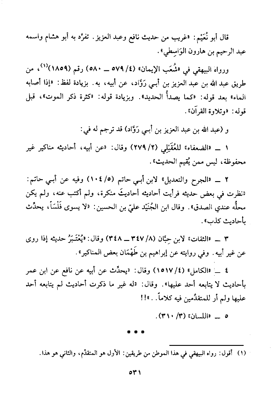 قال أبو نُعيم: "غريب من حديث نافع وعبد العزيز. تفرَّد به أبو هشام واسمه عبد الرحيم بن هارون الوَاسِطي".
