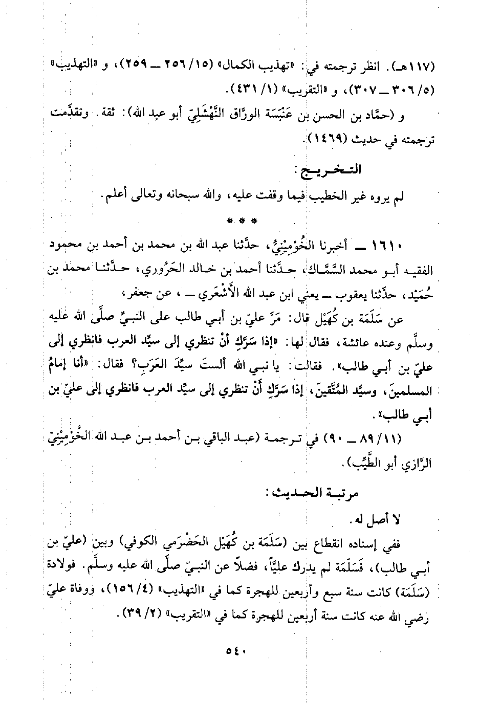 ففي إسناده انقطاع بين (سَلَمَة بن كُهَيْل الحَضْرَمي الكوفي) وبين (عليّ بن أبي طالب)، فَسَلَمَة لم يدرك عليًّا، فضلًا عن النبيّ صلَّى اللَّه عليه وسلَّم. فولادة (سَلَمَة) كانت سنة سبع وأربعين للهجرة كما في "التهذيب" (٤/ ١٥٦)، ووفاة عليّ رضي اللَّه عنه كانت سنة أربعين للهجرة كما في "التقريب" (٢/ ٣٩).