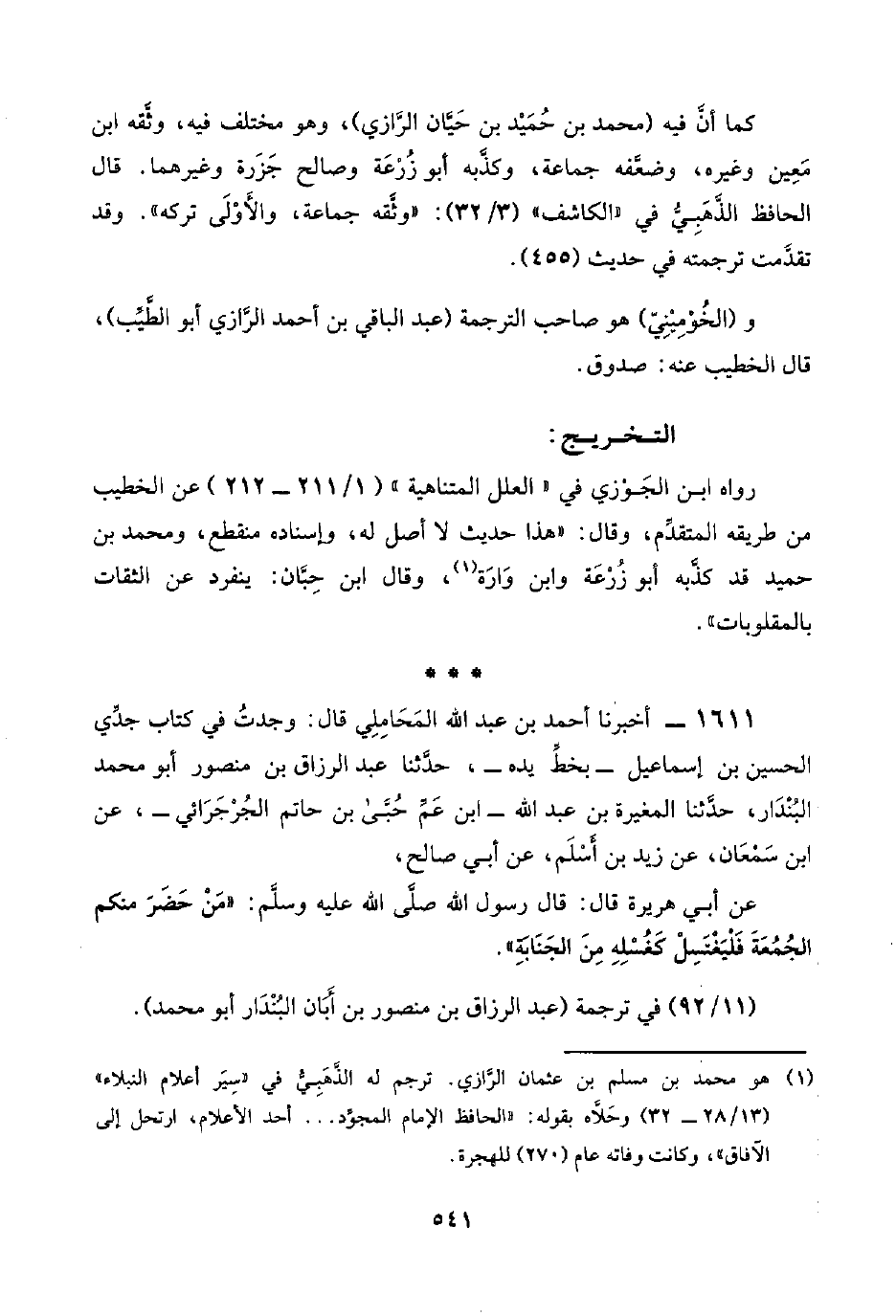 كما أنَّ فيه (محمد بن حُمَيْد بن حَيَّان الرَّازي)، وهو مختلف فيه، وثَّقه ابن مَعِين وغيره، وضعَّفه جماعة، وكذَّبه أبو زُرْعَة وصالح جَزَرة وغيرهما. قال الحافظ الذَّهَبِيُّ في "الكاشف" (٣/ ٣٢): "وثَّقه جماعة، والأَوْلَى تركه". وقد تقدَّمت ترجمته في حديث (٤٥٥).