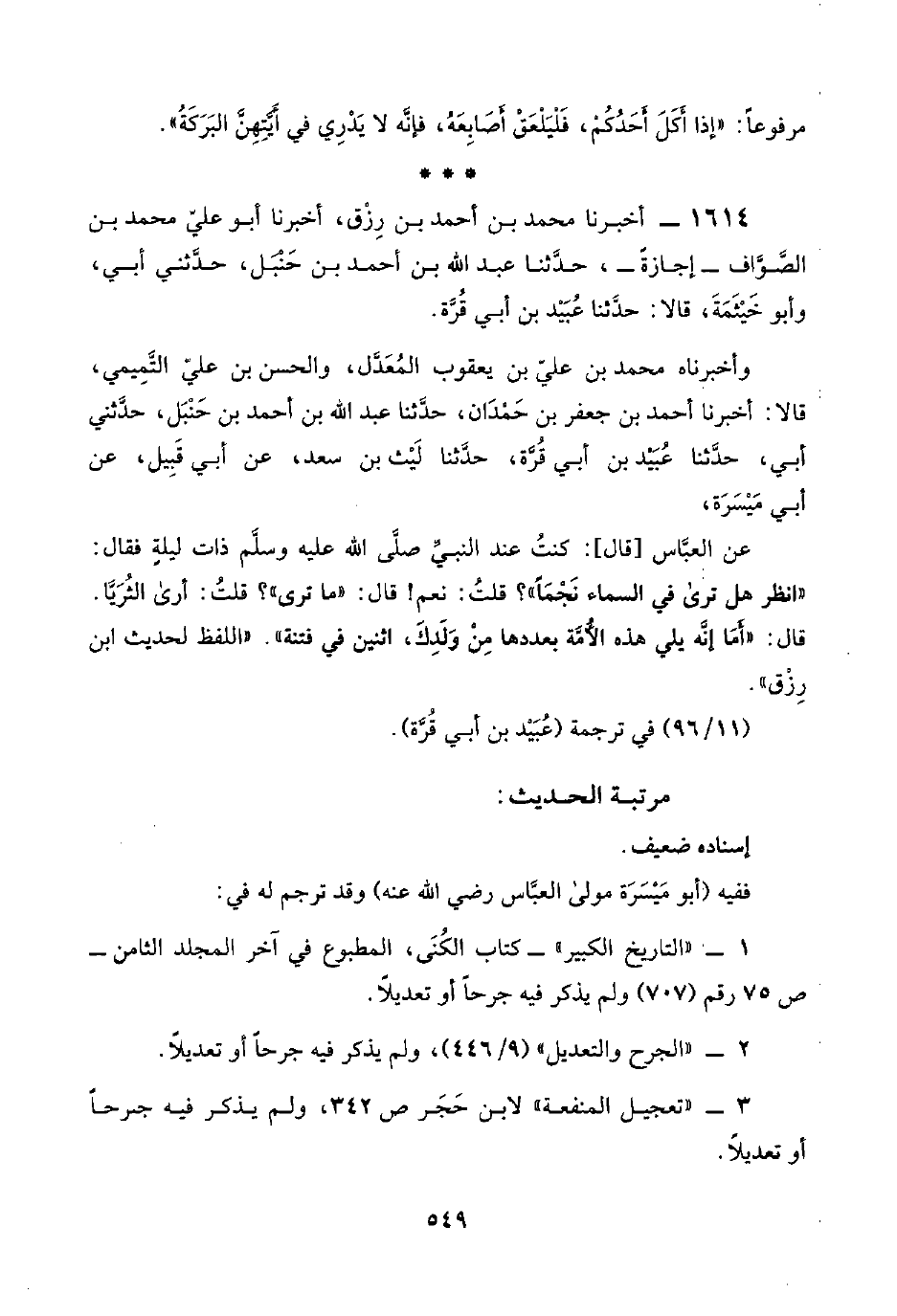 وأخبرناه محمد بن عليّ بن يعقوب المُعَدَّل، والحسن بن عليّ التَّمِيمي، قالا: أخبرنا أحمد بن جعفر بن حَمْدَان، حدَّثنا عبد اللَّه بن أحمد بن حَنْبَل، حدَّثني أبي، حدَّثنا عُبَيْد بن أبي قُرَّة، حدَّثنا لَيْث بن سعد، عن أبي قَبِيل، عن أبي مَيْسَرَة،