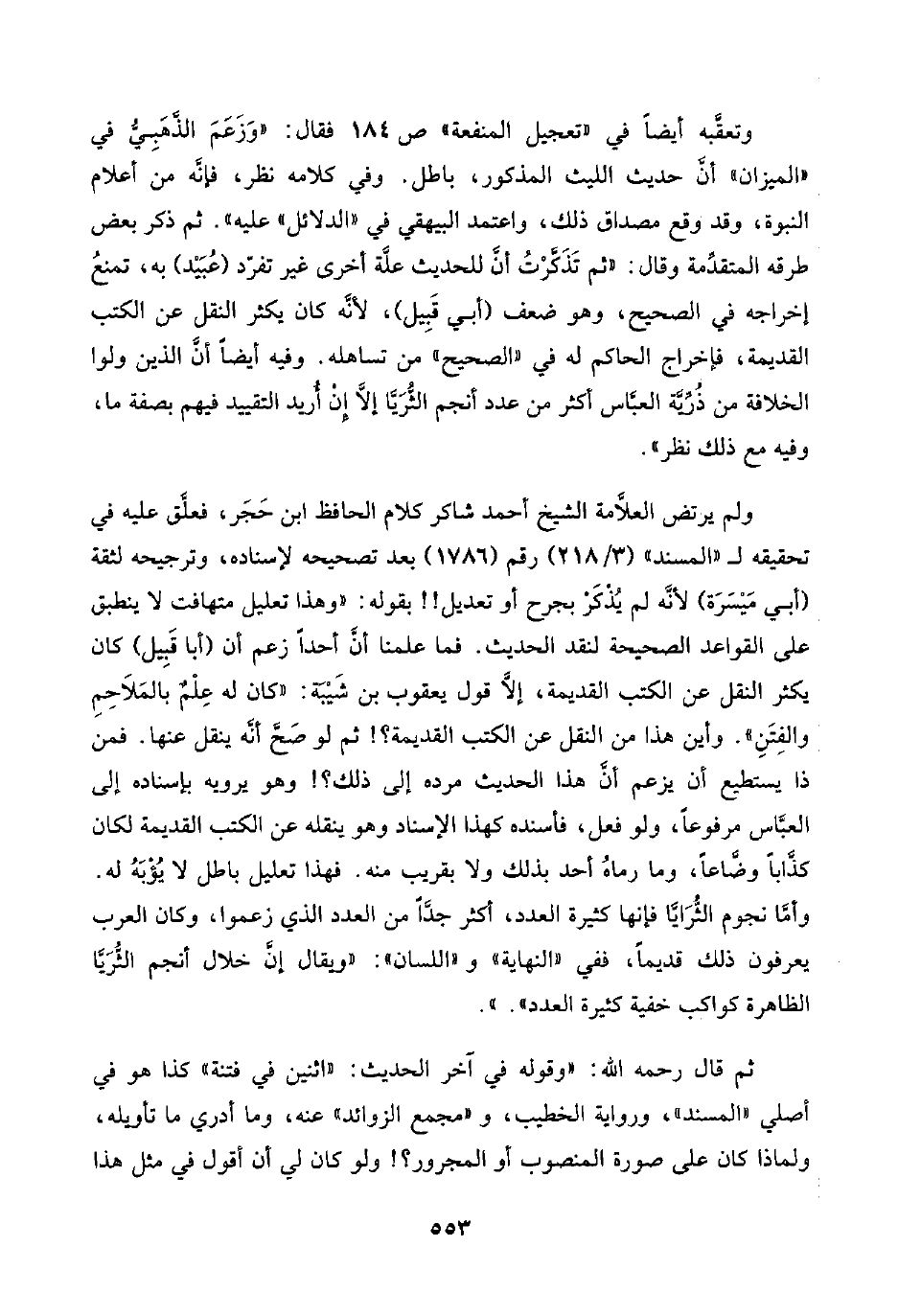 ولم يرتض العلَّامة الشيخ أحمد شاكر كلام الحافظ ابن حَجَر، فعلَّق عليه في تحقيقه لـ "المسند" (٣/ ٢١٨) رقم (١٧٨٦) بعد تصحيحه لإسناده، وترجيحه لثقة (أبي مَيْسَرَة) لأنَّه لم يُذْكَرْ بجرح أو تعديل! ! بقوله: "وهذا تعليل متهافت لا ينطبق على القواعد الصحيحة لنقد الحديث. فما علمنا أنَّ أحدًا زعم أن (أبا قَبِيل) كان يكثر النقل عن الكتب القديمة، إلَّا قول يعقوب بن شَيْبَة: "كان له عِلْمٌ بالمَلَاحِمِ والفِتَنِ". وأين هذا من النقل عن الكتب القديمة؟ ! ثم لو صَحَّ أنَّه ينقل عنها. فمن ذا يستطيع أن يزعم أنَّ هذا الحديث مرده إلى ذلك؟ ! وهو يرويه بإسناده إلى العبَّاس مرفوعًا، ولو فعل، فأسنده كهذا الإسناد وهو ينقله عن الكتب القديمة لكان كذَّابًا وضَّاعًا، وما رماهُ أحد بذلك ولا بقريب منه. فهذا تعليل باطل لا يُؤْبَهُ له. وأمَّا نجوم الثُّرَايَّا فإنها كثيرة العدد، أكثر جدًّا من العدد الذي زعموا، وكان العرب يعرفون ذلك قديمًا، ففي "النهاية" و"اللسان": "ويقال إنَّ خلال أنجم الثُّرَيَّا الظاهرة كواكب خفية كثيرة العدد".".