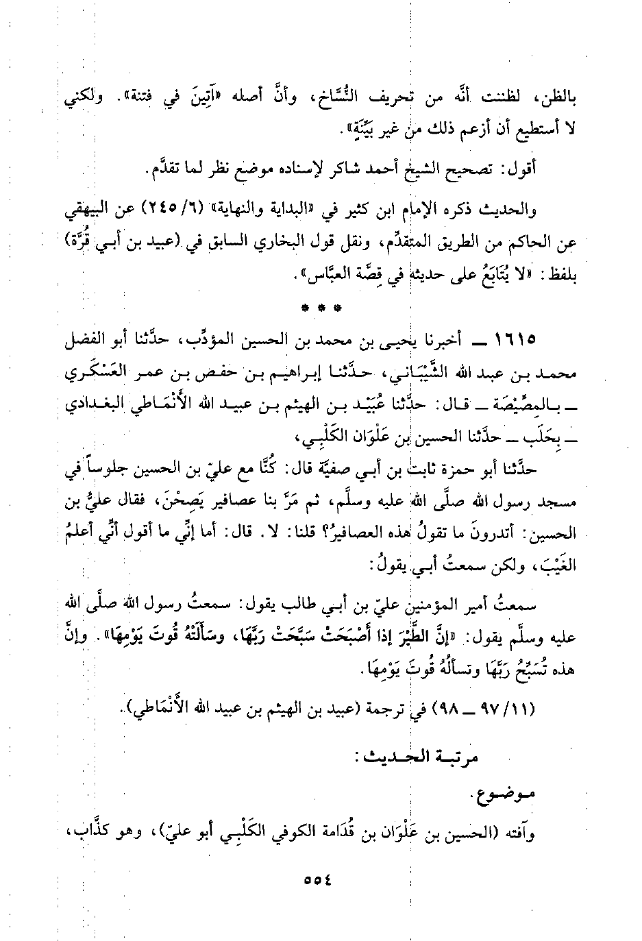 ١٦١٥ - أخبرنا يحيى بن محمد بن الحسين المؤدِّب، حدَّثنا أبو الفضل محمد بن عبد اللَّه الشَّيْبَاني، حدَّثنا إبراهيم بن حفص بن عمر العَسْكَري -بالمِصِّيْصَة- قال: حدَّثنا عُبَيْد بن الهيثم بن عبيد اللَّه الأَنْمَاطي البغدادي -بِحَلَب- حدَّثنا الحسين بن عَلْوَان الكَلْبِي،