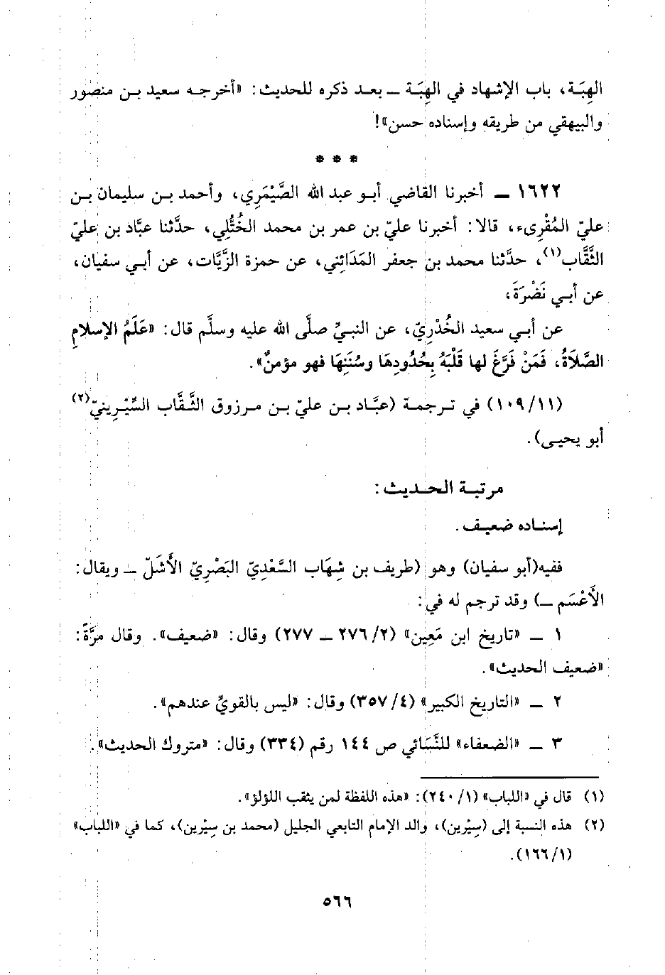 عن أبي سعيد الخُدْرِيّ، عن النبيِّ صلَّى اللَّه عليه وسلَّم قال: "عَلَمُ الإسلامِ الصَّلَاةُ، فَمَنْ فَرَّغَ لها قَلْبَهُ بِحُدُودِهَا وسُنَنِهَا فهو مؤمنٌ".