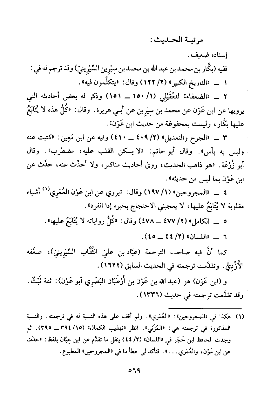 ٤ - "والمجروحين" (١/ ١٩٧) وقال: "يروي عن ابن عَوْن العُمَرِي (¬١) أشياء مقلوبة لا يُتَابَعُ عليها، لا يعجبني الاحتجاج بخبره إذا انفرد".