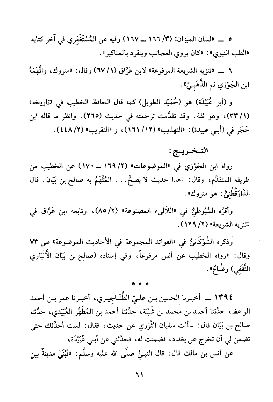 ٦ - "تنزيه الشريعة المرفوعة" لابن عَرَّاق (١/ ٦٧) وقال: "متروك، واتَّهَمَه ابن الجَوْزي ثم الذَّهَبِيّ".