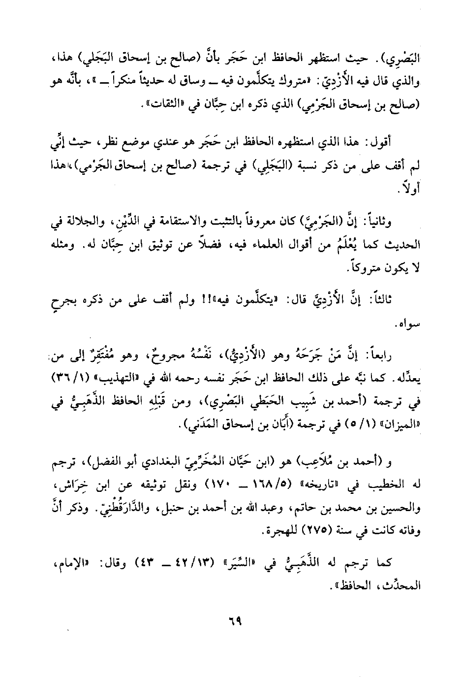 البَصْرِي). حيث استظهر الحافظ ابن حَجَر بأنَّ (صالح بن إسحاق البَجَلي) هذا، والذي قال فيه الأَزْدِيّ: "متروك يتكلَّمون فيه -وساق له حديثًا منكرًا-"، بأنَّه هو (صالح بن إسحاق الجَرْمِي) الذي ذكره ابن حِبَّان في "الثقات".
