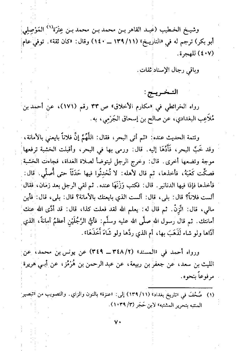 وتتمة الحديث عنده: "ثم أتى البحر، فقال: اللَّهُمَّ إنَّ فلانًا بايعني بالأمانة، وقد خَبَّ البحر، فَأَدِّهَا إليه. قال: ورمى بها في البحر، وأقبلت الخشبة ترفعها موجة وتضعها أخرى. قال: وخرج الرجل ليتوضأ لصلاة الغداة، فجاءت الخشبة فصكَّت كَعْبَهُ، فأخذها، ثم قال لأهله: لا تُحْدِثُوا فيها حَدَثًا حتى أُصلِّي. قال: فأخذها فإذا فيها الدنانير. قال: فكتب وَزْنَهَا عنده. ثم لقي الرجل بعد زمان، فقال ألست فلانًا؟ قال: بلى، قال: ألست الذي بايعتك بالأمانة؟ قال: بلى، قال: فأين مالي، قال: اتَّزِنْ. ثم قال له: يعلم اللَّه لقد فعلت كذا، قال: قد أدَّي اللَّه عنك أمانتك. ثم قال رسول اللَّه صلَّى اللَّه عليه وسلَّم: فأيُّ الرَّجُلَيْنِ أعظمُ أمانةً، الذي أذَّاها ولو شاء لَذَهَبَ بها، أم الذي ردَّها ولو شَاءَ أَخَذَهَا".