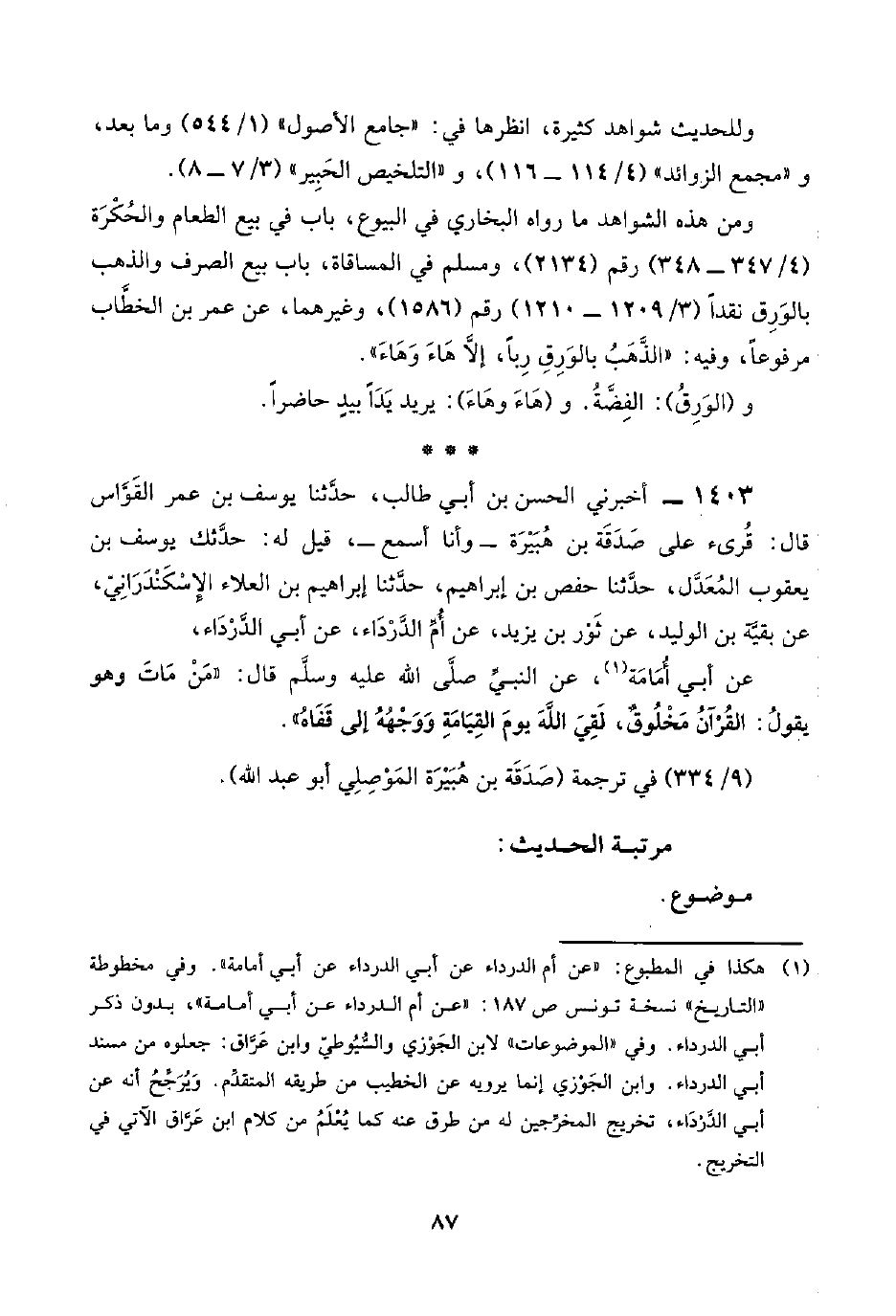 ١٤٠٣ - أخبرني الحسن بن أبي طالب، حدَّثنا يوسف بن عمر القَوَّاس قال: قُرِئ على صَدَقَة بن هُبَيْرَة -وأنا أسمع-، قيل له: حدَّثك يوسف بن يعقوب المُعَدَّل، حدَّثنا حفص بن إبراهيم، حدَّثنا إبراهيم بن العلاء الإِسْكَنْدَرَانِيّ، عن بقيَّة بن الوليد، عن ثَوْر بن يزيد، عن أُمِّ الدَّرْدَاء، عن أبي الدَّرْدَاء،