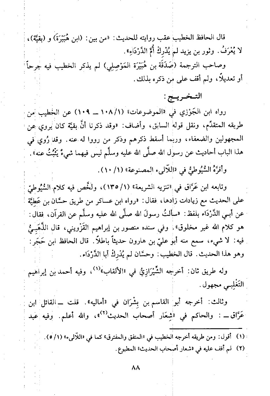 قال الحافظ الخطيب عقب روايته للحديث: "من بين: (ابن هُبَيْرَةَ) و (بقيَّة)، لا يُعْرَفُ. وثور بن يزيد لم يُدْرِكْ أُمَّ الدَّرْدَاءِ".