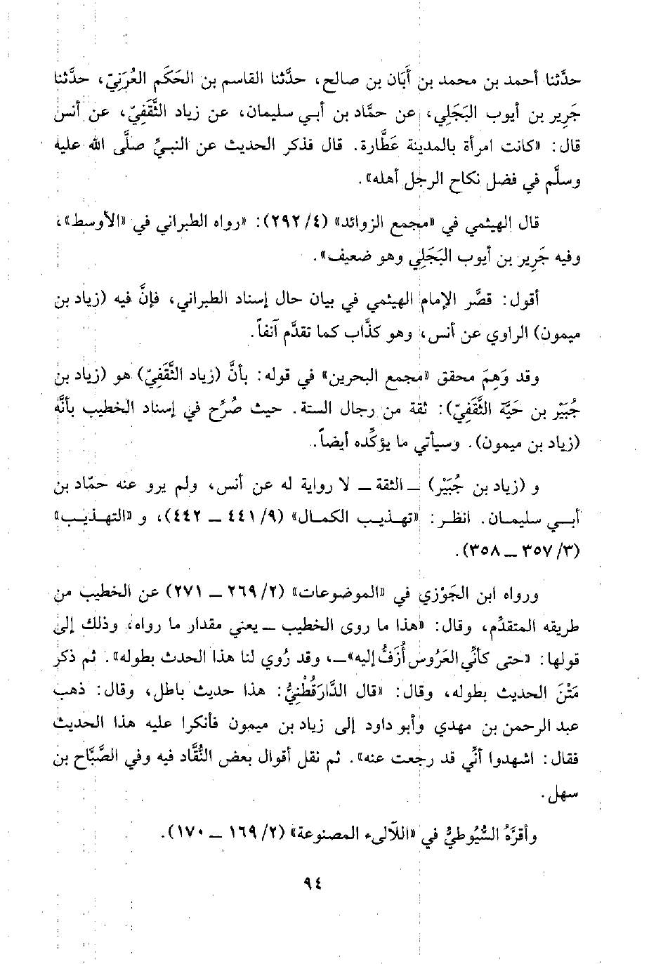 حدَّثنا أحمد بن محمد بن أَبَان بن صالح، حدَّثنا القاسم بن الحَكَم العُرَنِيّ، حدَّثنا جَرِير بن أيوب البَجَلي، عن حمَّاد بن أبي سليمان، عن زياد الثَّقَفِيّ، عن أنس قال: "كانت امرأة بالمدينة عَطَّارة. قال فذكر الحديث عن النبيِّ صلَّى اللَّه عليه وسلَّم في فضل نكاح الرجل أهله".