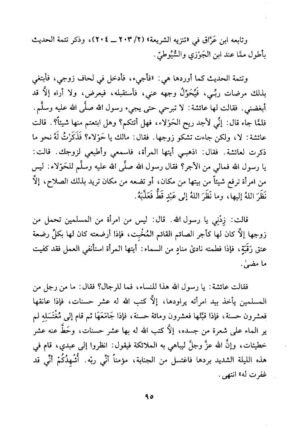 فقالت عائشة: يا رسول اللَّه هذا للنساء، فما للرجال؟ فقال: ما من رجل من المسلمين يأخذ بيد امرأته يراودها، إلَّا كتب اللَّه له عشر حسنات، فإذا عانقها فعشرون حسنة، فإذا قبَّلها فعشرون ومائة حسنة، فإذا جَامَعَهَا ثم قام إلى مُغْتَسَلِهِ لم ير الماء على شعرة من جسده، إلَّا كتب اللَّه له بها عشر حسنات، وحَطَّ عنه عشر خطيئات، وإنَّ اللَّه عزَّ وجلَّ ليباهي به الملائكة فيقول: انظروا إلى عبدي، قام في هذه الليلة الشديد بردها فاغتسل من الجنابة، مؤمنًا أنِّي ربّه. أُشْهِدُكُمْ أنِّي قد غفرت له" انتهى.
