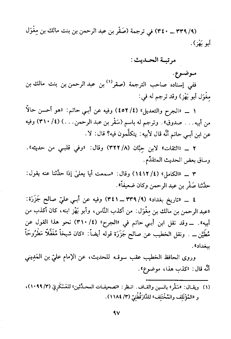 ٤ - "تاريخ بغداد" (٩/ ٣٣٩ - ٣٤١) وفيه عن أبي عليّ صالح جَزَرَة: "عبد الرحمن بن مالك بن مِغْوَل: من أكذب النَّاس، وأبو بَهْز ابنه، كان أكذب من أبيه". -وقد نقل ابن أبي حاتم في "الجرح" (٤/ ٣١٠) نحو هذا القول عن مُطَيَّن-. ونقل الخطيب عن صالح جَزَرَة قوله أيضًا: "كان شيخًا مُغَفَّلًا مَطْرُوحًا ببغداد".
