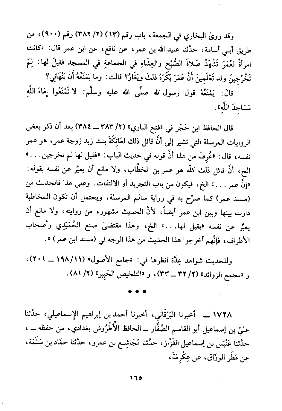 قال الحافظ ابن حَجَر في "فتح الباري" (٢/ ٣٨٣ - ٣٨٤) بعد أن ذكر بعض الروايات المرسلة التي تشير إلى أنَّ قائل ذلك لعَاتِكَةَ بنت زيد زوجة عمر، هو عمر نفسه، قال: "عُرِفَ من هذا أنَّ قوله في حديث الباب: "فقيل لها لم تخرجين. . . " الخ، أنَّ قائل ذلك كلّه هو عمر بن الخَطَّاب، ولا مانع أن يعبِّر عن نفسه بقوله: "إنَّ عمر. . . " الخ، فيكون من باب التجريد أو الالتفات. وعلى هذا فالحديث من (مسند عمر) كما صرَّح به في رواية سالم المرسلة، ويحتمل أن تكون المخاطبة دارت بينها وبين ابن عمر أيضًا، لأنَّ الحديث مشهور، من روايته، ولا مانع أن يعبِّر عن نفسه "بقيل لها. . . " الخ، وهذا مقتضى صنع الحُمَيْدي وأصحاب الأطراف، فإنَّهم أخرجوا هذا الحديث من هذا الوجه في (مسند ابن عمر) ".
